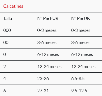 000 (0-3meses), 00 (3-6meses), 0 (6-12meses), 2 (12-24meses), 4 (23-26pie), 6 (27-31pie)