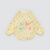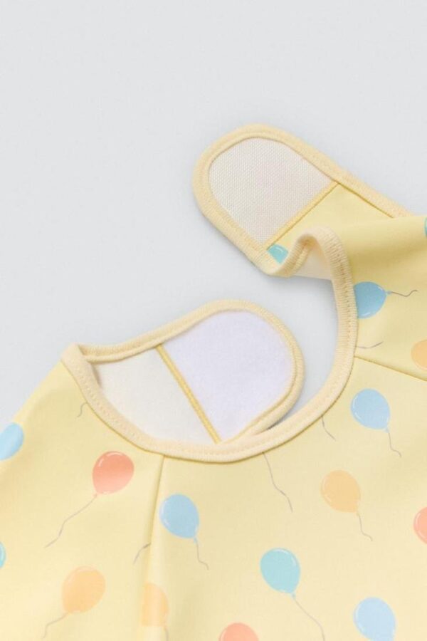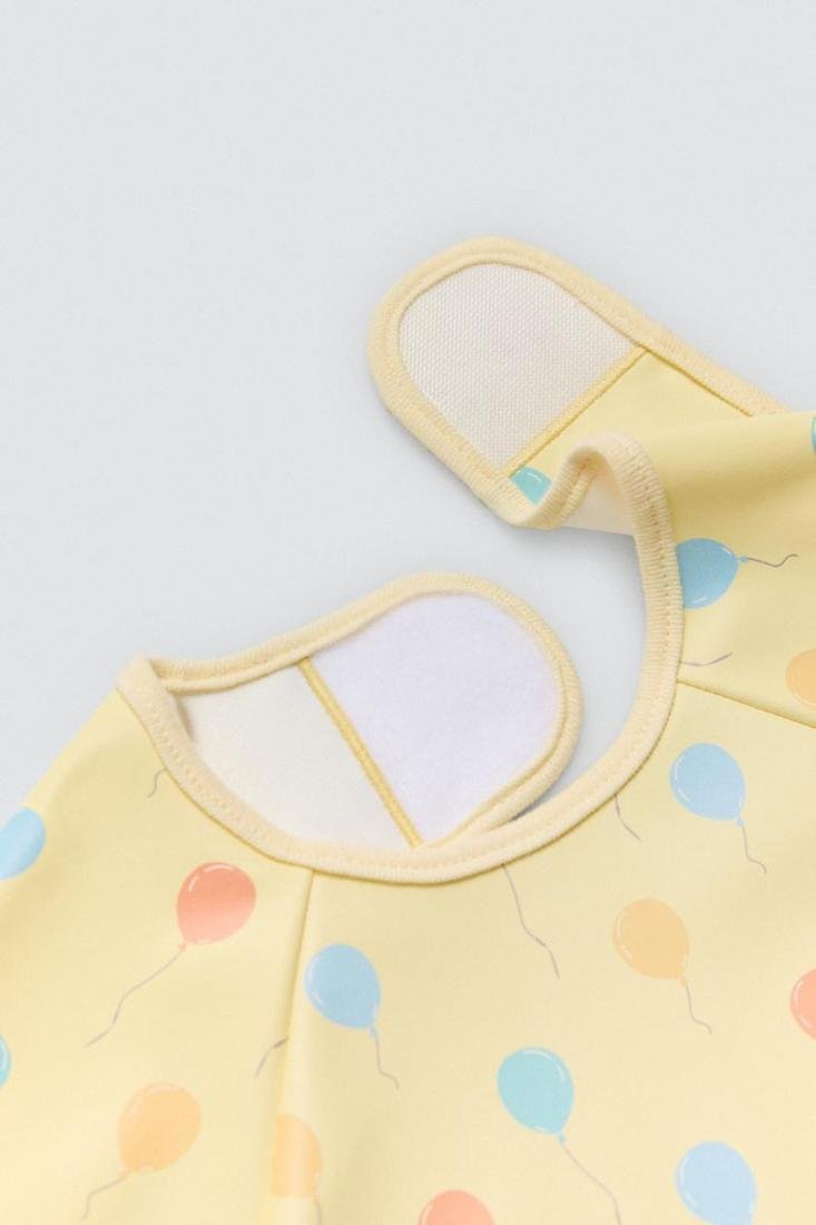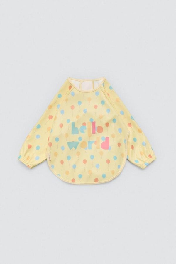 Babero de bebé impermeable de manga larga engomado. Color amarillo pastel con detalle de globos de colores y frase.