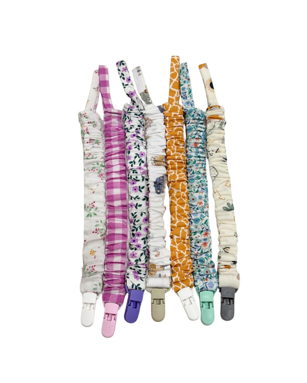 Chupetero confeccionado a mano en nuestro taller con tejidos de calidad, varios estampados (vichy,flores…) y con efecto arrugado.