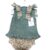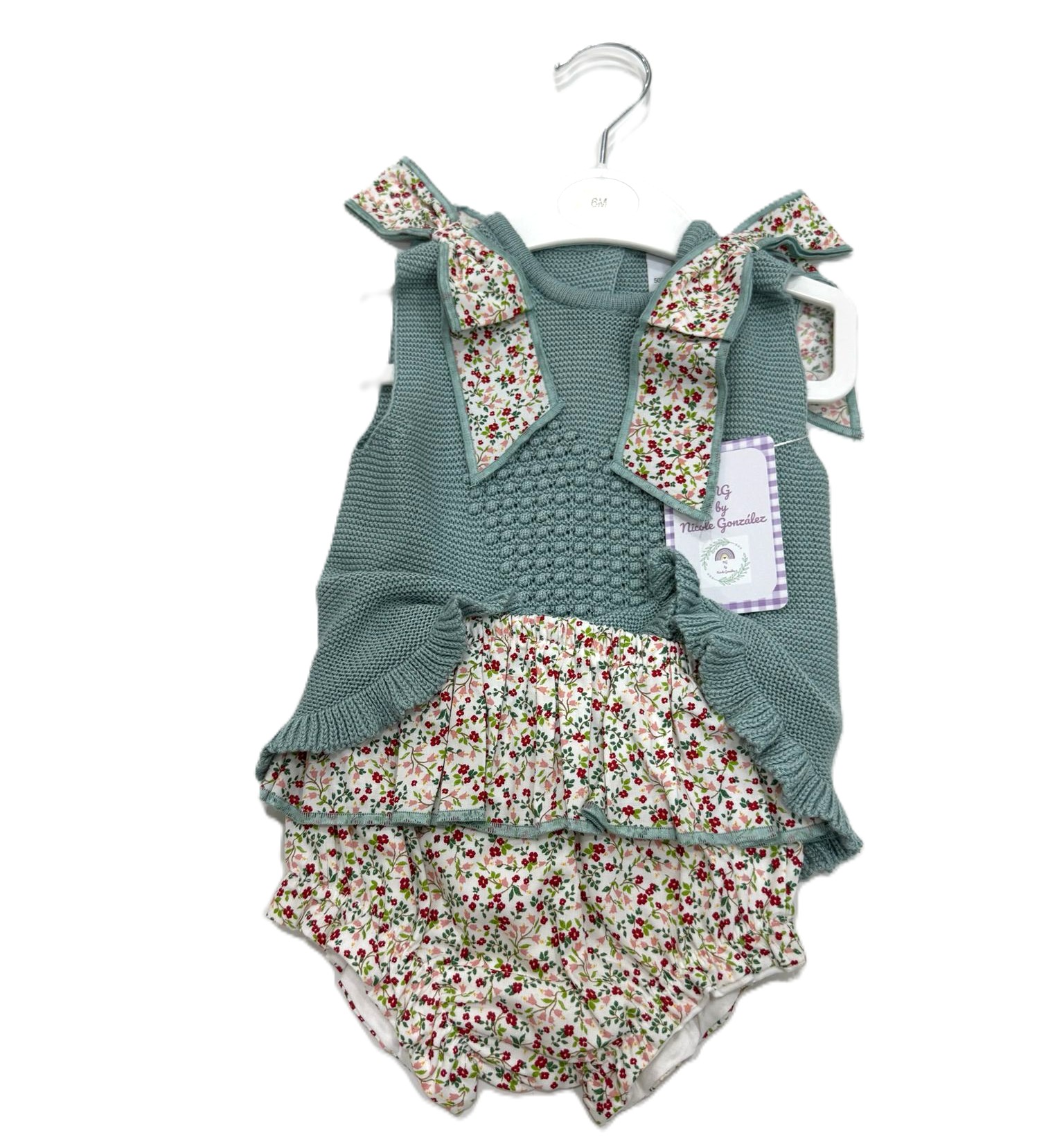 Conjunto dos piezas de vestido de punto con calados haciendo volante en la parte inferior y detalle delantero con corazón, a su vez lleva botonadura en la espalda y dos lazos en los hombros estampados con flores. La braguita con volante es del mismo tejido de flores que los lazos del vestido.