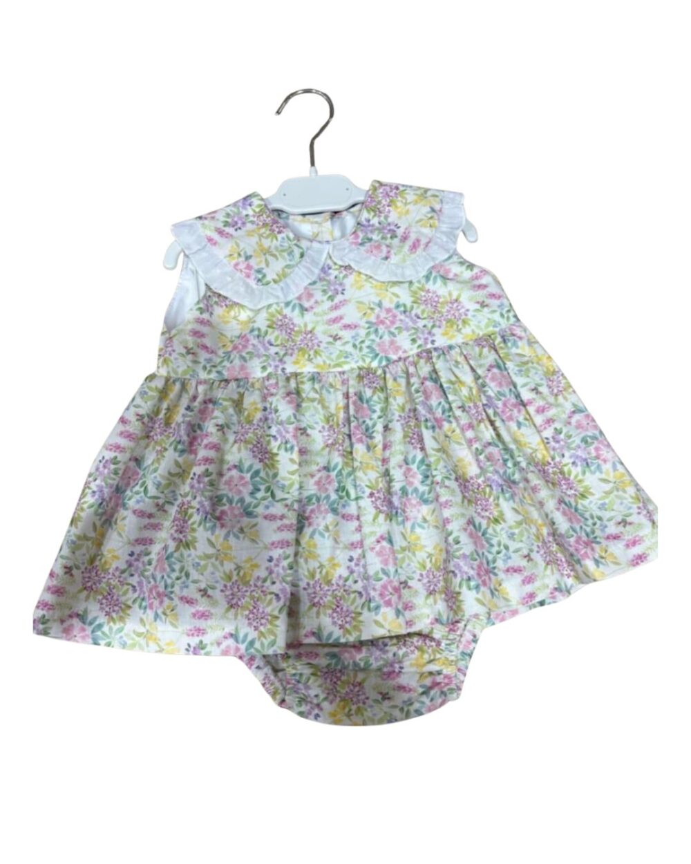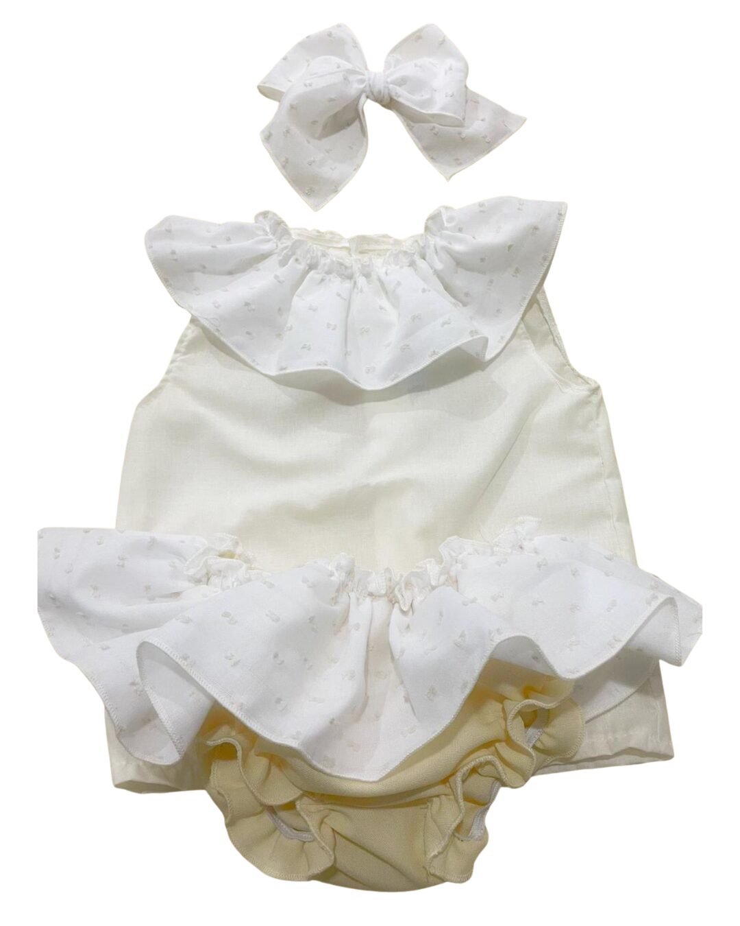 Conjunto compuesto por blusa de algodón color crema con cuello plumeti, a juego braga color vainilla con volante en el tejido del volante de la blusa y con gomitas elásticas anti presión. Incluye lazo de pelo.