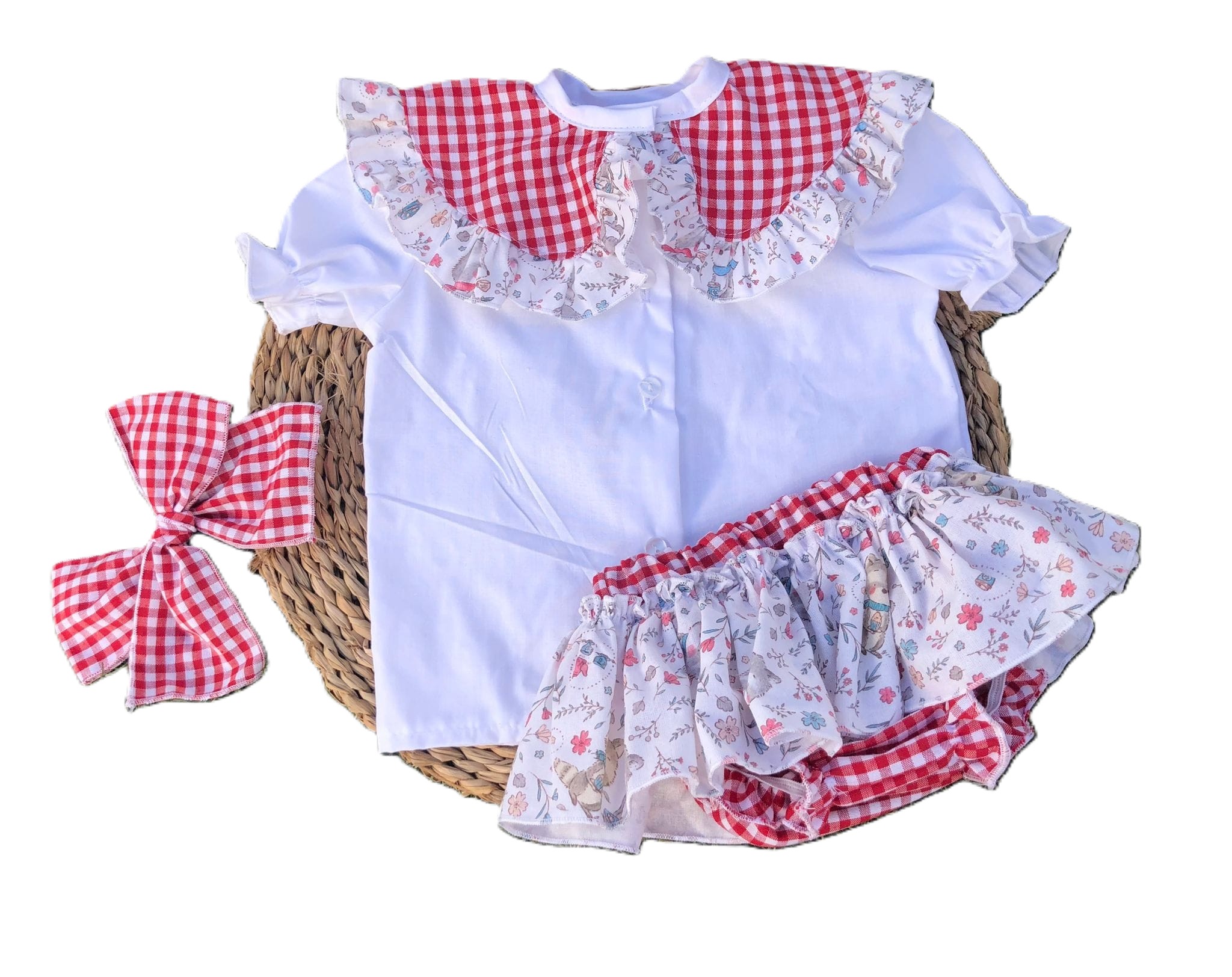 Conjunto de tres piezas compuesto por blusa blanca con cuello estampado, braguita de vichy rojo y volante en el estampado del cuello (flores liberty) y lazo del pelo a juego.