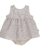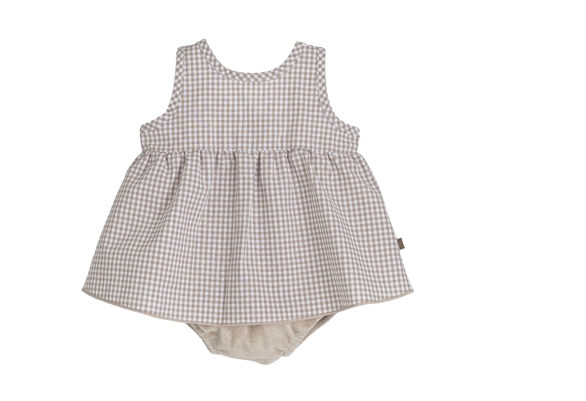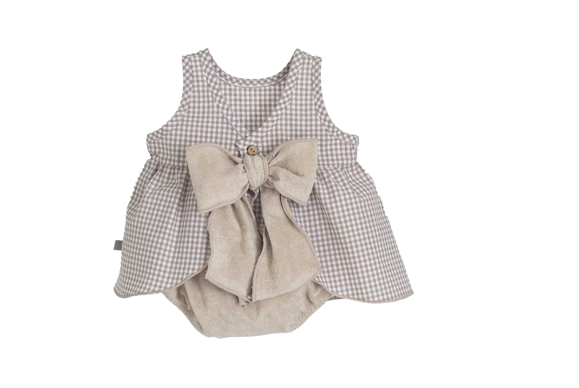 Jesusito dos piezas de la colección MANDI de Calamaro, compuesto por braguita confeccionada en rizo de toalla color beige con lazo grande detrás y blusa en vichy en el mismo tono del pololo con abertura en la espalda para que se vea el lazo de la braguita.