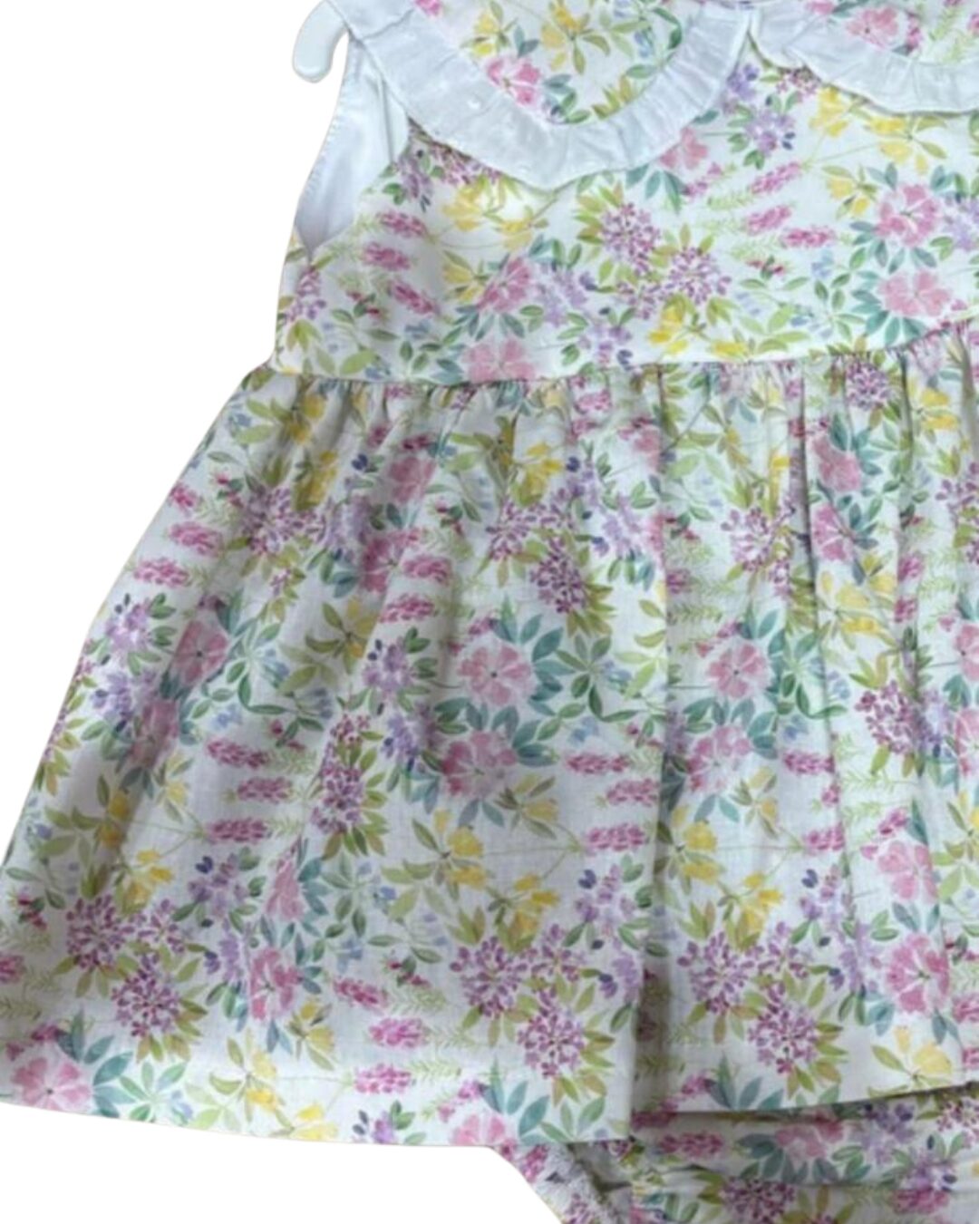 Conjunto compuesto por jesusito de flores con corte debajo del pecho y botonadura en la espalda, con cuello bebé con detalle de plumeti. A juego lleva la braguita en el mismo estampado con gomitas elásticas anti presión.