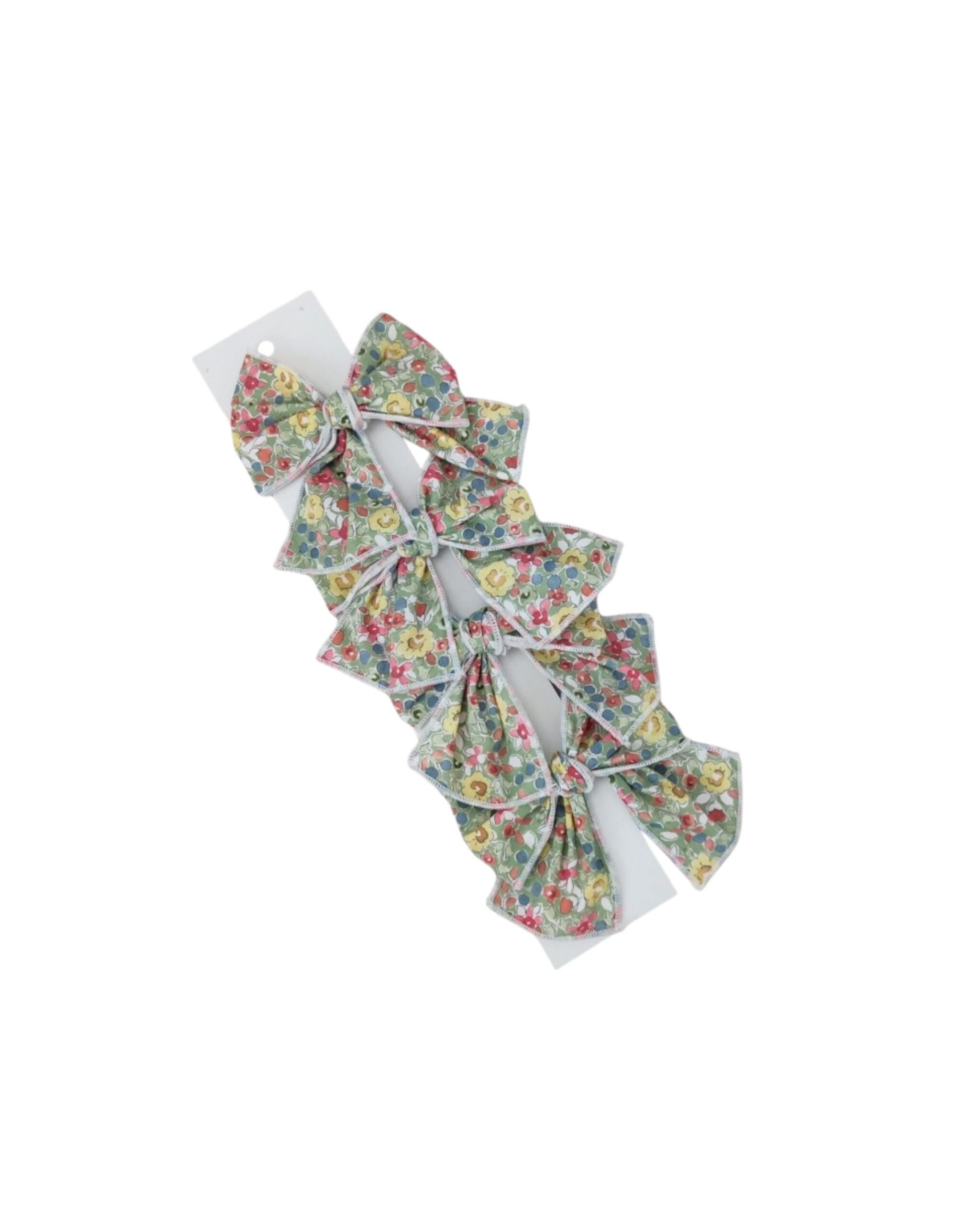 Lazo con pinza en tejido de algodón estampado de flores liberty con colores verdes, amarillos y rojos. Tamaño aproximado 8cm.
