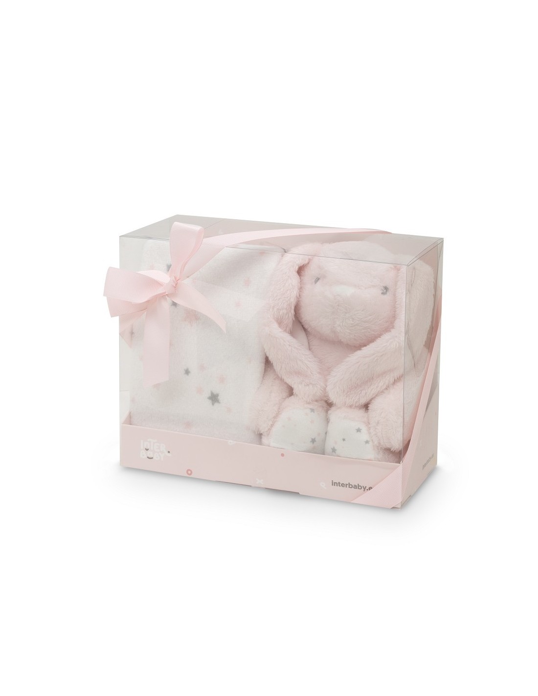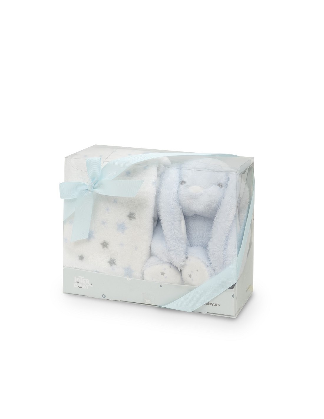 Manta de coralina con estampado de estrellitas y peluche conejo, se presenta en cajita ideal para regalo. Se puede PERSONALIZAR.