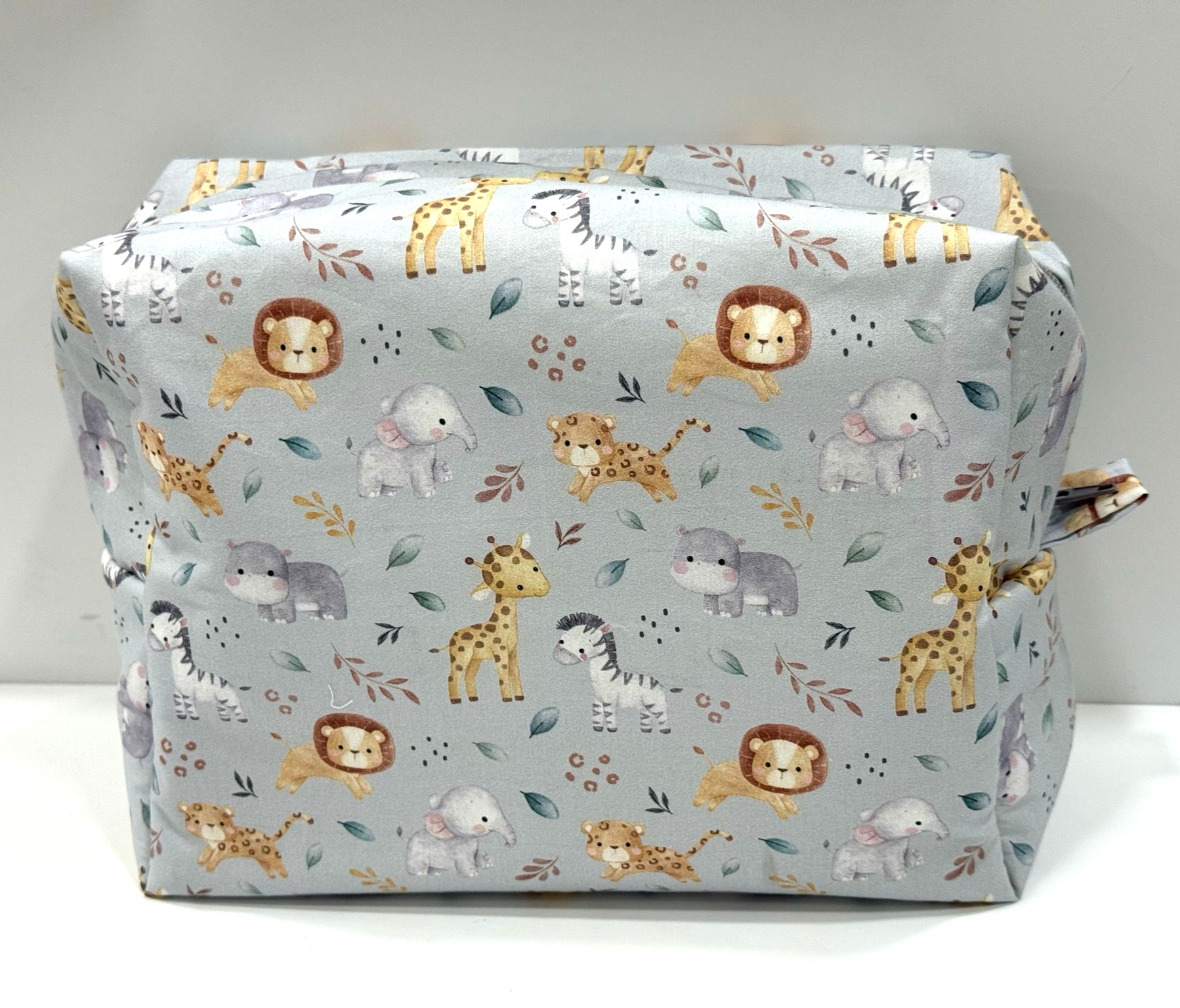 Neceser con estampado de animalitos de la jungla. Se confeccionan artesanalmente con tejidos de calidad, en el exterior lleva un tejido de algodón con estampado, en el interior un relleno de guata para dar algo de cuerpo y va todo forrado, cierra con cremallera . Incluye en el exterior una asa que sirve para colgar, por ejemplo de un gancho del carro.