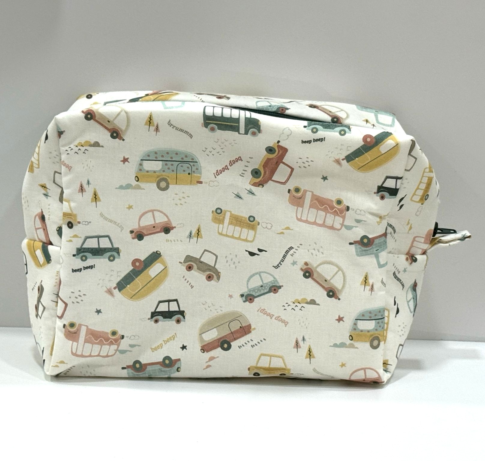 Neceser con estampado de vehículos. Se confeccionan artesanalmente con tejidos de calidad, en el exterior lleva un tejido de algodón con estampado, en el interior un relleno de guata para dar algo de cuerpo y va todo forrado, cierra con cremallera . Incluye en el exterior una asa que sirve para colgar, por ejemplo de un gancho del carro.