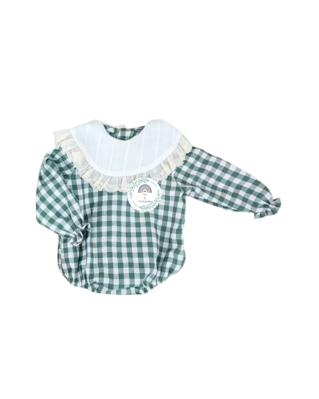 Pelele confeccionado en algodón con estampado de cuadros en verde seco con detalle de cuello en crudo con ribete de encaje, talla normal y lleva cierre de botones en la espalda y entrepierna.