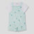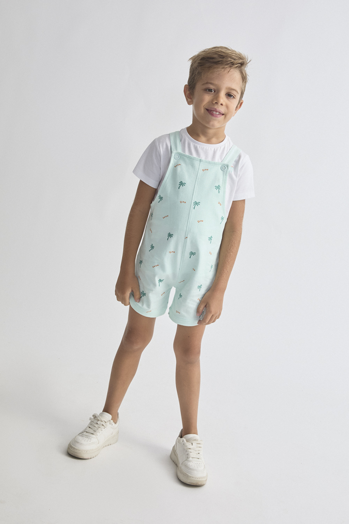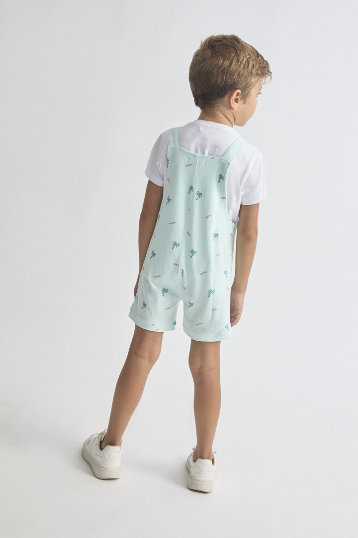 Conjunto de dos piezas, camiseta y peto. Camiseta blanca de manga corta con cuello redondo. Peto en color verde agua con estampado de palmeras y texto, tirantes abotonados y cierre con botones a presión en la parte inferior.