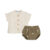 Conjunto dos piezas de camisa confeccionada en tejido similar al lino a juego con pololo de bambula color caqui con detalles bordados de palmeras en color lino.